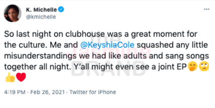 “So last night on clubhouse was a great moment for the culture. Me and @KeyshiaColesquashed any little misunderstandings we had like adults and sang songs together all night.”