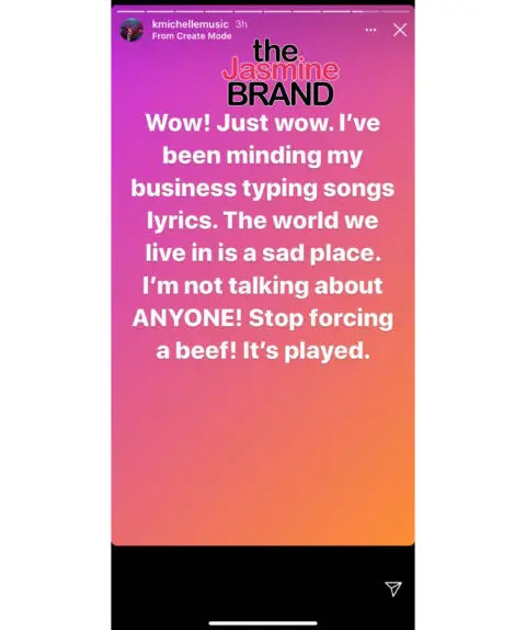 “Wow! Just wow. I’ve been minding my business typing song lyrics. The world we live in is a sad place. I’m not talking about ANYONE! Stop forcing a beef. It’s played.”