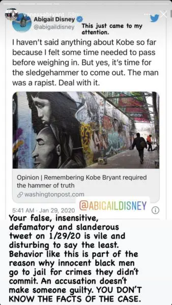 Vanessa Bryant sent the same message to film producer Abigail Disney, who tweeted just days after Kobe Bryant’s death,