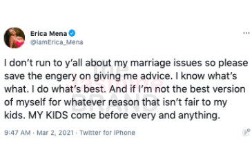 “I don’t run to y’all about my marriage issues so please save the energy [sic] on giving me advice. I know what’s what. I do what’s best. And if I’m not the best version of myself for whatever reason that isn’t fair to my kids. MY KIDS come before every and anything.”
