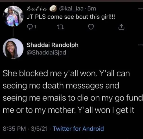 “She blocked me y’all won. “Y’all can [keep sending] me death messages and [sending] me emails to die on my go fund me or to my mother. Y’all won I get it.”