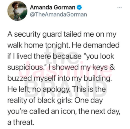 “A security guard tailed me on my walk home tonight. He demanded if I lived there because “you look suspicious.” I showed my keys & buzzed myself into my building. He left, no apology. This is the reality of black girls: One day you’re called an icon, the next day, a threat.”