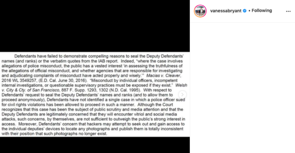 Multiple deputies of the Los Angeles County Sheriff’s Department are accused of taking and/or sharing pictures from the crash site. Judge John F. Walter ruled Monday (March 8th) that Vanessa Bryant can know the identities of the deputies.