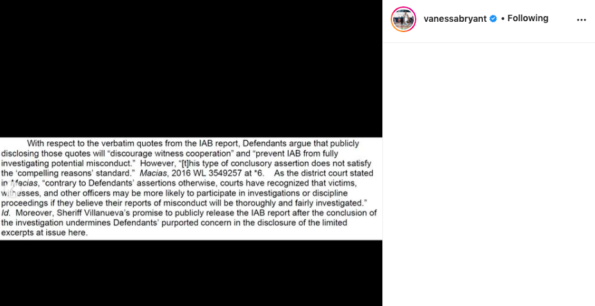 Vanessa Bryant states in the lawsuit that Sheriff Alex Villanueva tried to cover it up by telling the deputies if they deleted the photos they wouldn’t face any discipline, in order to get rid of the evidence. Sheriff Villanueva reportedly did not let the families know about the photos, and they instead found out on social media.