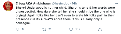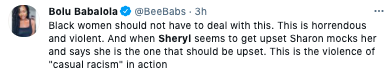 “It is not the exact words of racism. It’s the implication and the reaction to it. To not want to address that because she is a black woman, and to try to dismiss it, or make it seem less than what it is, that’s what makes it racism.”
