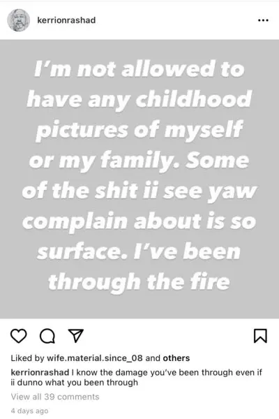 In a Instagram post shared four days ago, Kerrion claimed that he is not allowed to have any childhood photos of himself or his family.