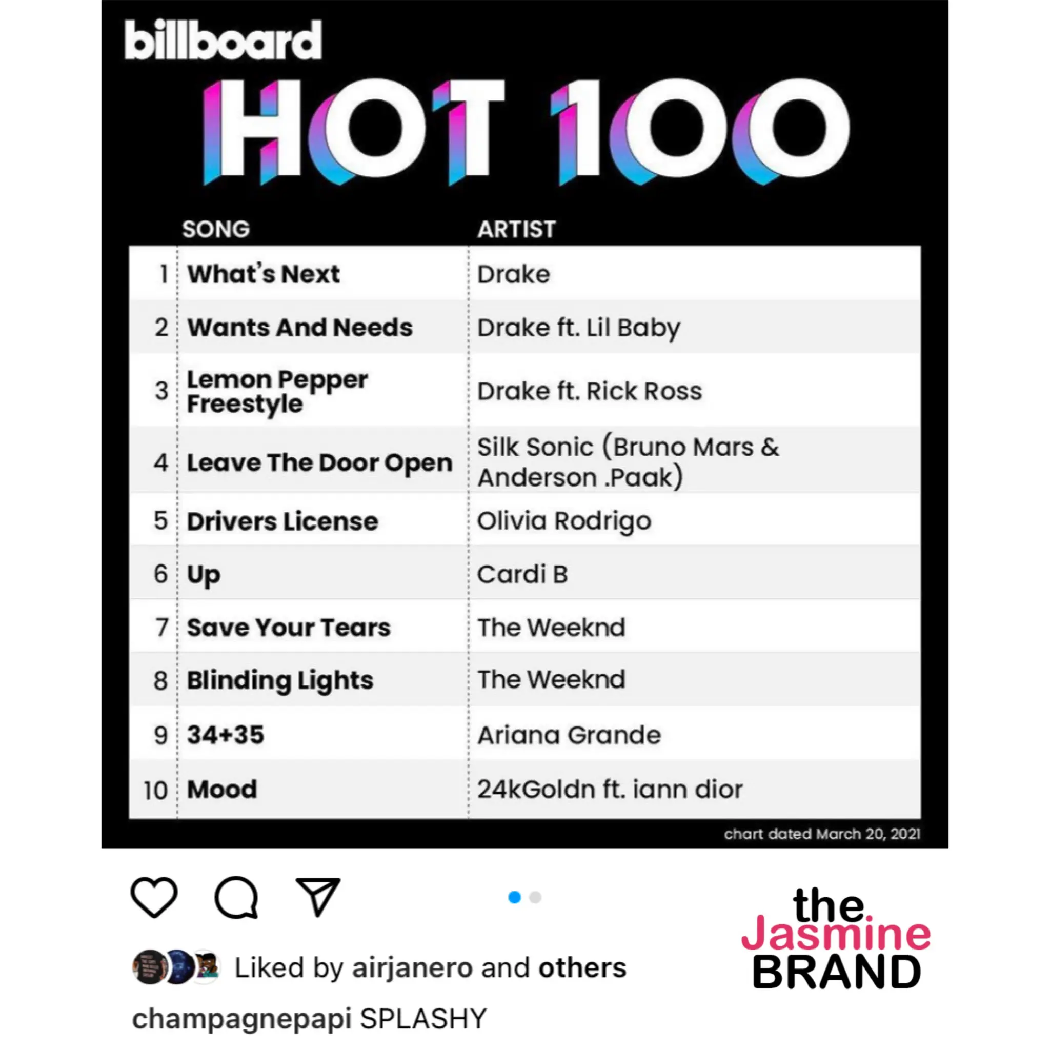 The three songs were released on March 5th. They are: “What’s Next,” “Wants and Needs” with Lil Baby and “Lemon Pepper Freestyle” with Rick Ross. He now joins The Beatles and Ariana Grande as the only artists to have three songs rank in the top 3 simultaneously.
