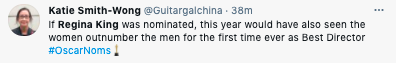While the Oscars have a record number of female directors it’s recognizing via nominations this year, Regina King isn’t on the list.