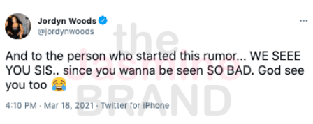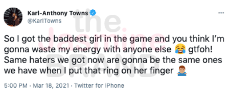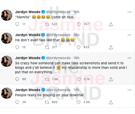Jordyn Woods took to Twitter to shut down screenshots, that have since been deleted, that appeared to show Karl-Anthony Towns communicating with another woman. In the message, Karl-Anthony Towns allegedly made plans to meet up with the woman while Jordyn Woods was out of town.