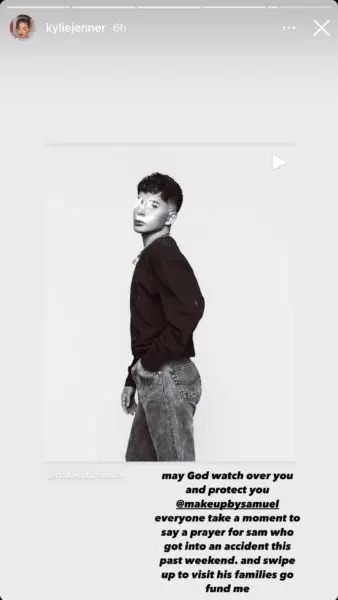 “May God watch over you and protect you @makeupbysamuel. Everyone take a moment to say a prayer for Sam who got into an accident this past weekend. And swipe up to visit his families’ GoFundMe.”