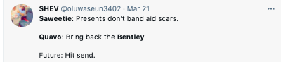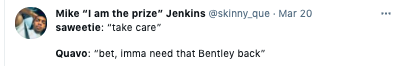 Quavo taking back the Bentley from Saweetie https://t.co/Djym99KSrR