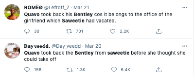 Fans speculated that Quavo took back the Bentley he gifted Saweetie with when they were still going strong. Some reports alleged he got the luxury car repossessed on Saturday morning (March 20th).
