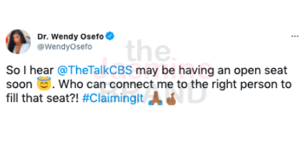 “So I hear @TheTalkCBS may be having an open seat soon. Who can connect me to the right person to fill that seat?! #ClaimingIt“