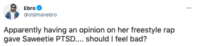“Apparently having an opinion on her freestyle rap gave Saweetie PTSD…. should I feel bad?”