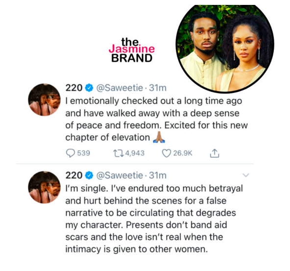 Many people are speculating that the lyric is about his ex, 27-year-old Saweetie. As previously reported, Saweetie, born Diamonté Harper, and Quavo went public with their breakup last week and announced the end of their two-year relationship. According to Saweetie, the relationship ended over betrayal and hurt. The ‘ICY GRL’ rapper also alleged that Quavo cheated on her as well.