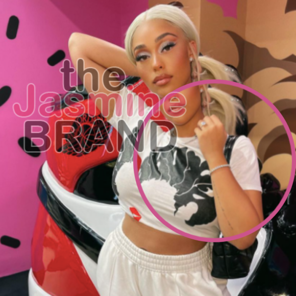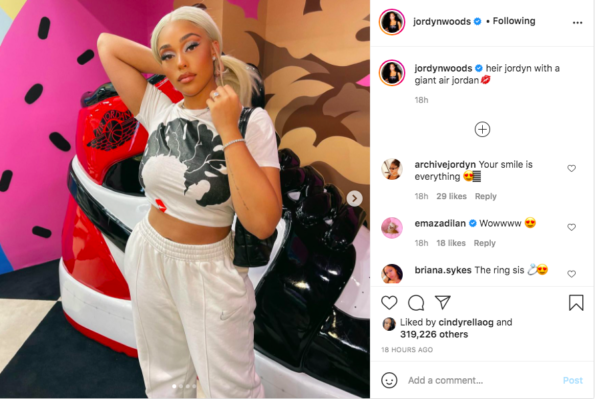 Original Story (March 25th): Jordyn Woods’ latest Instagram post has caused many people to speculate that the 23-year-old model/socialite is now engaged to her NBA boyfriend Karl-Anthony Towns! Yesterday (Wednesday, March 24th) Jordyn Woods uploaded a photo to her Instagram account of herself posing in front of a giant air Jordan shoe. In the image, she’s casually dressed in a pair of white Nike sweats and a graphic white tee. Even though her fit is simple many fans couldn’t help but notice that Jordyn Woods seemed to have topped off her look with what appears to be an engagement ring.