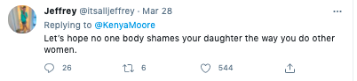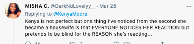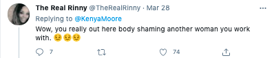 The comment came after Drew made remarks about Kenya’s butt after Kenya refused to take part in a “booty bounce” to secure an ideal room on a cast trip in New Orleans, saying she would not “degrade” herself. Drew Sidora told cameras,