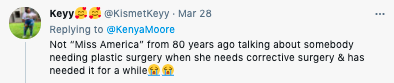 She said that Kenya’s photo showed her suffering from her condition but also being “in the house gaining a nice amount of quarantine weight” after three Achilles tendon surgeries. She added,