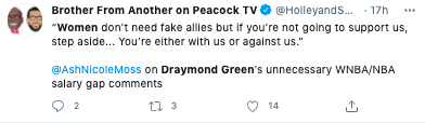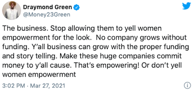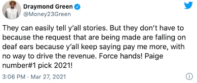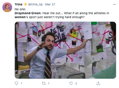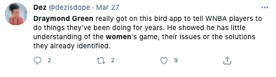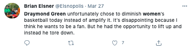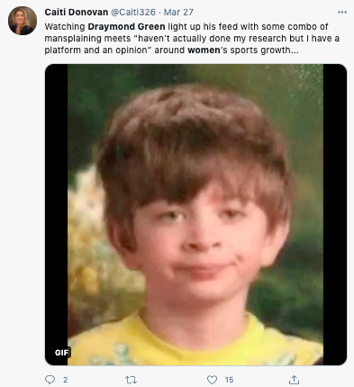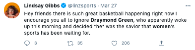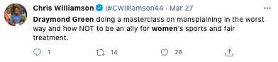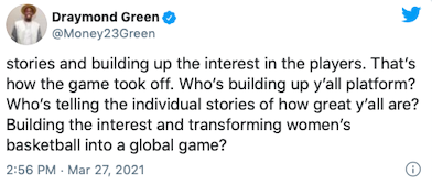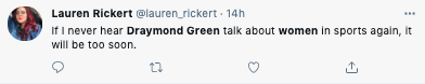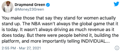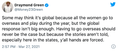 Today Draymond talked about his Tweets about women's sports that received criticism from athletes like @mPinoe & @Layshiac @kron4news #DubNation pic.twitter.com/7iUQ982jx9— Kylen Mills (@KylenMills) April 1, 2021