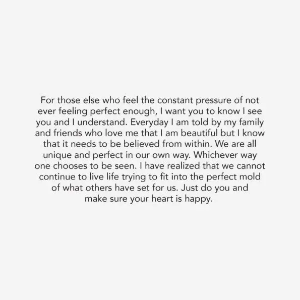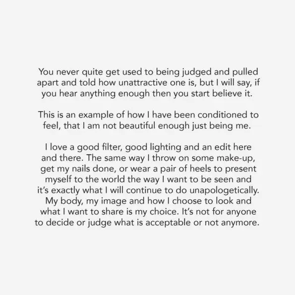“Hey guys, this is me and my body unretouched and unfiltered,” she wrote. “The photo that was posted this week was beautiful. But as someone who has struggled with body image her whole life, when someone takes a photo of you that isn’t flattering in bad lighting or doesn’t capture your body the way it is after working to hard to get it to this point – and then shares it to the world – you should have every right to ask for it not to be shared – no matter who you are. In truth, the pressure, constant ridicule and judgment my entire life to be perfect and to meet other’s standards of how I should look has been too much to bear.”