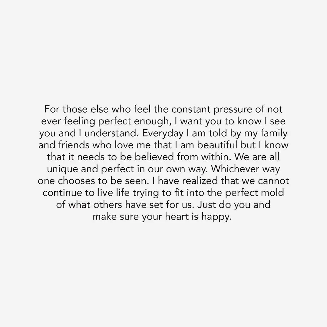 “Hey guys, this is me and my body unretouched and unfiltered,” she wrote. “The photo that was posted this week was beautiful. But as someone who has struggled with body image her whole life, when someone takes a photo of you that isn’t flattering in bad lighting or doesn’t capture your body the way it is after working to hard to get it to this point – and then shares it to the world – you should have every right to ask for it not to be shared – no matter who you are. In truth, the pressure, constant ridicule and judgment my entire life to be perfect and to meet other’s standards of how I should look has been too much to bear.”