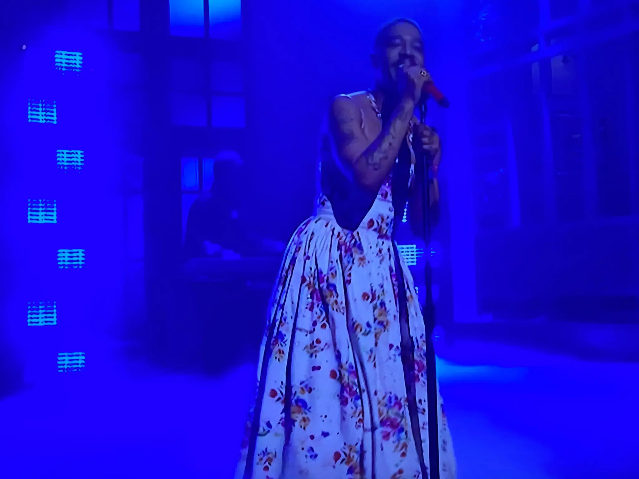 For his second performance, he changed into a white spaghetti-strap floral dress, which many speculated was an ode to