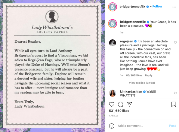 The show’s resident gossip Lady Whistledown announced Regé-Jean Page’s exit via Instagram on April 2nd.