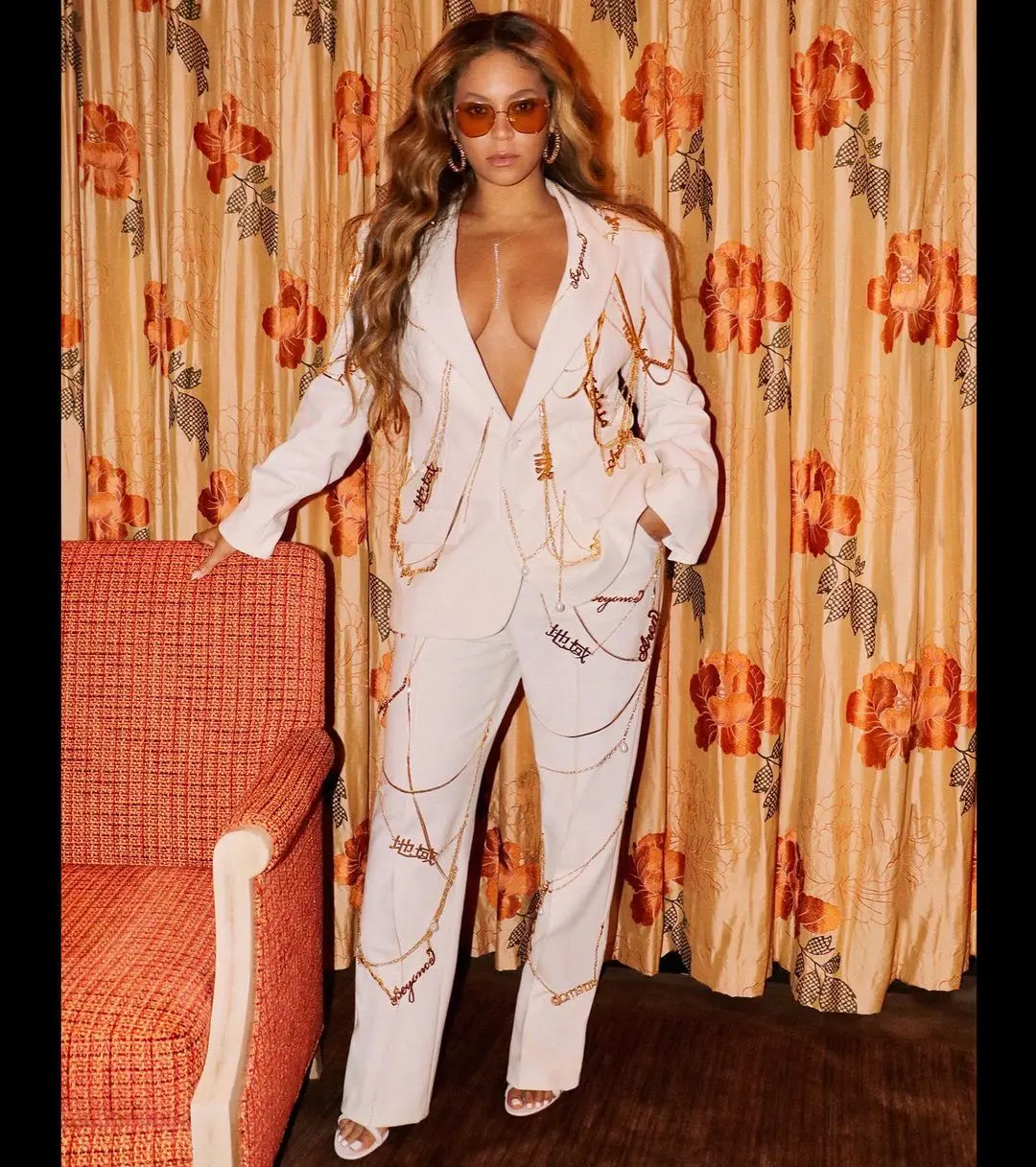 Wearing an all-white, shirtless pant suit, the mommy of three, donned clear shades, gold earrings, pairing the look a white, heel.