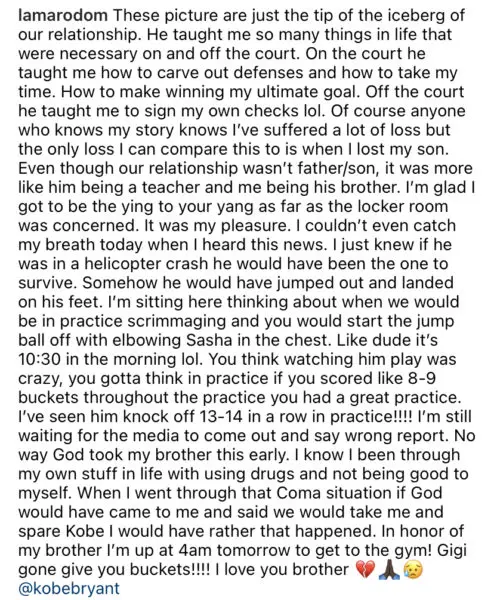 Lamar Odom added that was one of the last times they talked before Kobe Bryant’s untimely death.