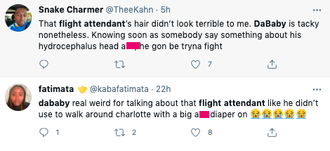 DaBaby had plenty of jokes about a flight attendant’s hair, but it only resulted in lots of fans slamming him for mocking her.
