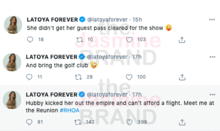 “Hubby kicked her out the empire and can’t afford a flight. Meet me at the Reunion #RHOA”