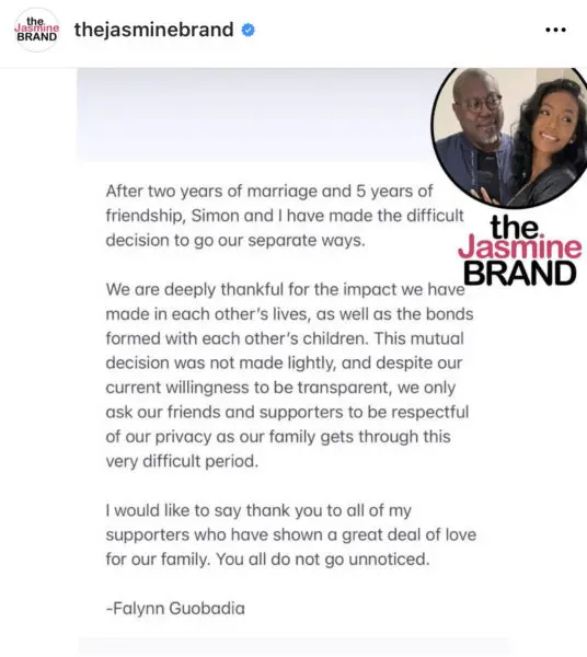 “After two years of marriage and five years of friendship,” Falynn’s announcement began, “Simon and I have made the difficult decision to go our separate ways. We are deeply thankful for the impact we have made and each other’s lives, as well as the bonds formed with each other’s children.”