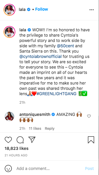 “WOW?? I’m so honored to have the privilege to share Cyntoia’s powerful story and to work side by side with my family @50cent and Santa Sierra on this. Thank you @cyntoiabrownofficial for trusting us to tell your story. We are so excited for everyone to see this – Cyntoia made an imprint on all of our hearts the past few years and it was imperative for me to make sure her own past was shared through her lens [prayer hands emoji] [red heart emoji] #GREENLIGHTGANG [full battery charge emoji] [green check emoji]”