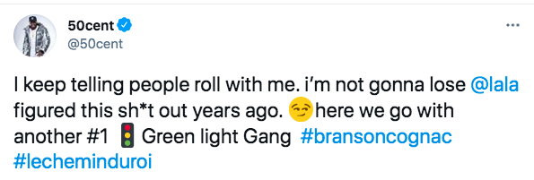 “I keep telling people roll with me. I’m not gonna lose [Lala Anthony] figured this sh*t out years ago. [Smirking face emoji] we go with another #1 [traffic light emoji] Green light Gang #bransoncognac #lecheminduroi”