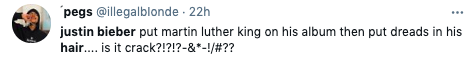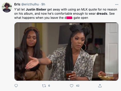 y’all really should be embarrassed to stan Justin Bieber in 2021. from the use of the n word.. to the dreads.. to the tone dead MLK interlude.. when does enough become enough? pic.twitter.com/hlSNosPrVr