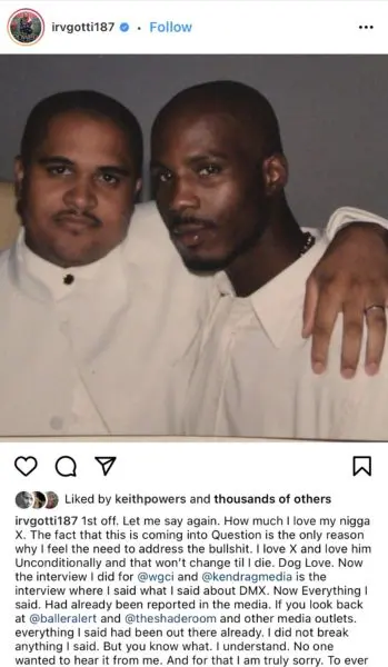 “Again. I apologize for talking out of turn. In my defense. I honestly thought I wasn’t saying anything that everyone didn’t hear already. If anyone thinks the love I have for X is nothing but genuine unconditional love. Just look at our history. Really look at it. And there is no way you can think that. Love you X. Until I die and see you again. #ripdmx #doglove #ruffryders #family”