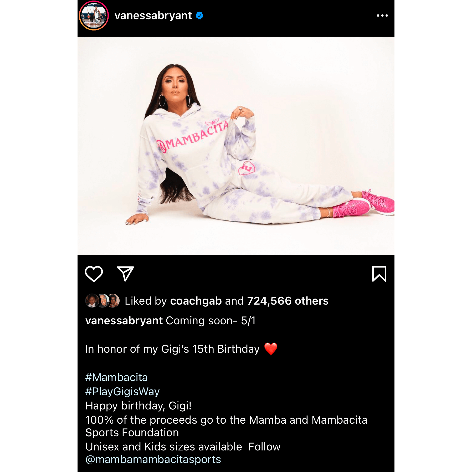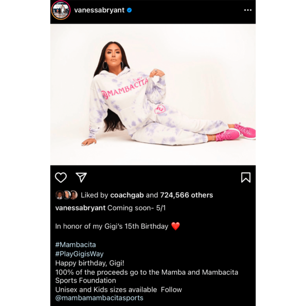 “Coming Soon-5/1. In honor of my Gigi’s 15th birthday [red heart emoji] Happy Birthday, Gigi! 100% of the proceeds go to the Mamba and Mambacita Sports Foundation. Unisex and Kids sizes available.”