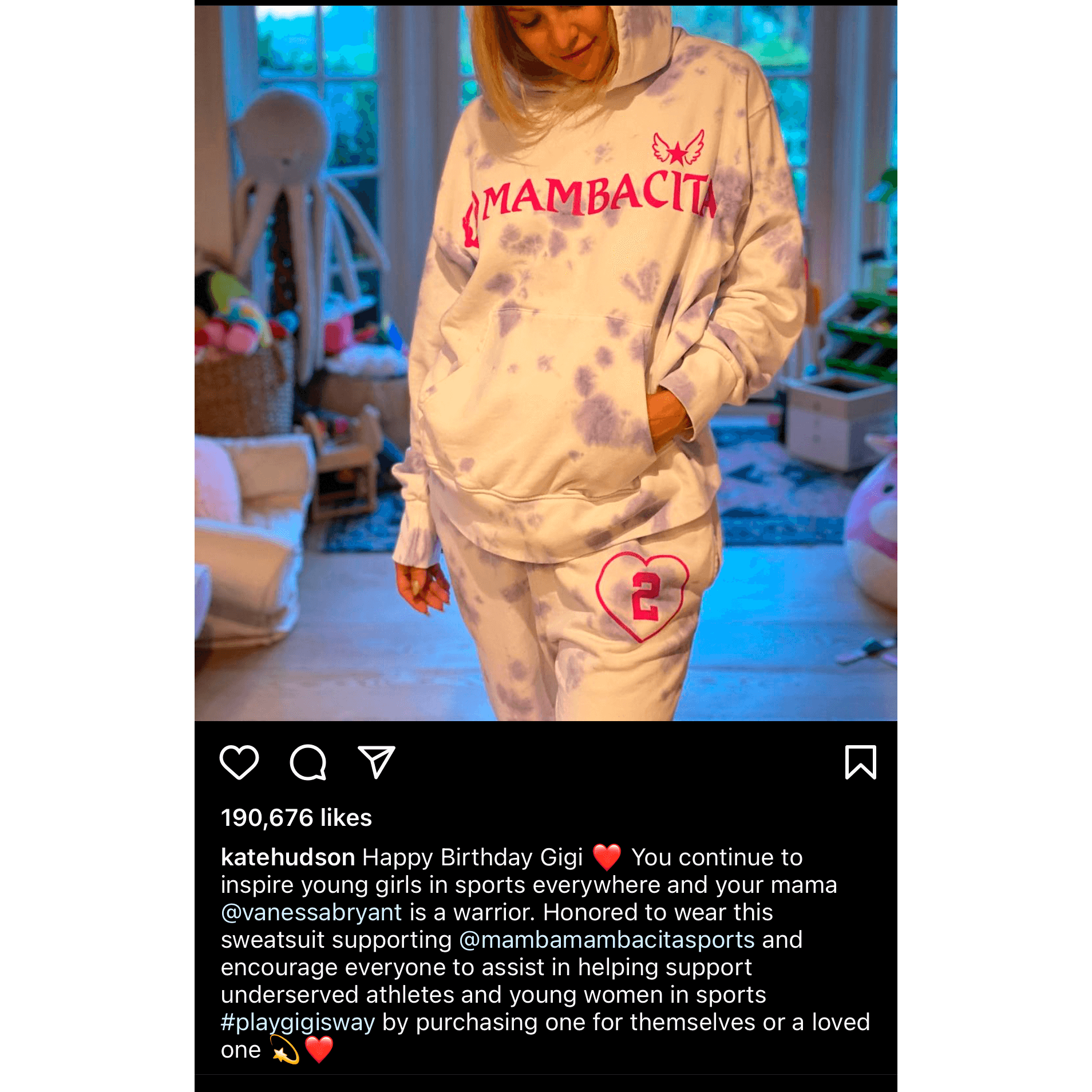 The line of unisex athletic wear is named after Gianna Bryant’s basketball nickname, in a nod to her father, whom Lakers fans called the “Black Mamba”. The pants feature a graphic of the number 2 with a heart around it, representing Gianna’s basketball number.