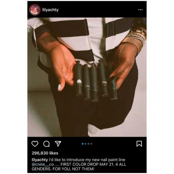 “I’d like to introduce my new nail paint line @crete__co …. FIRST COLOR DROP MAY 21. 4 ALL GENDERS. FOR YOU, NOT THEM!”