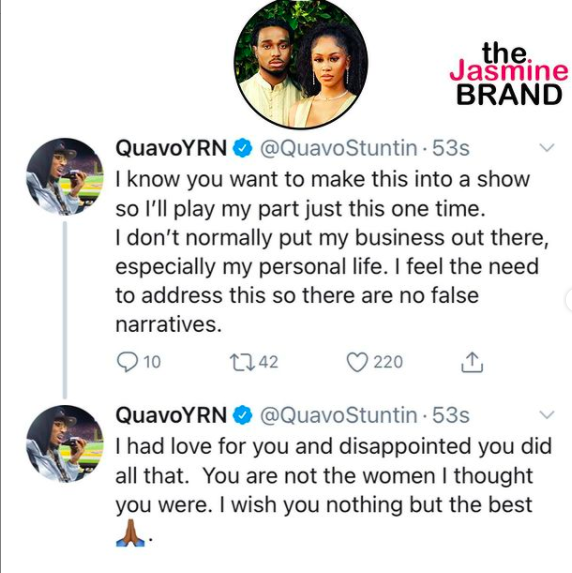 Saweetie announced their breakup via Twitter earlier this month after being with Quavo for roughly three years. Her tweets lead to a back and forth between them.