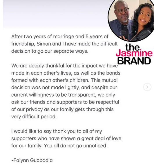 “I want to thank everyone for reaching out to me and offering their love and support. At this time, I am focusing on finalizing my divorce and healing. Sending positivity to all of you.”