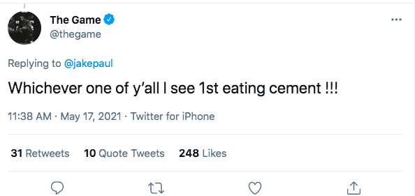 The Game wasted no time in sending his own threat back to Jake Paul. He responded,