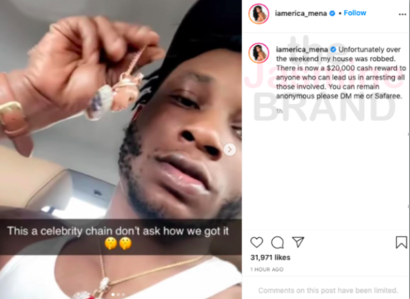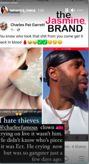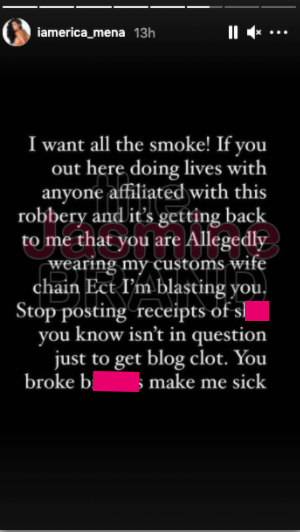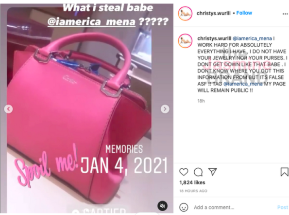 “I WORK HARD FOR ABSOLUTELY EVERYTHING I HAVE , I DO NOT HAVE YOUR JEWELRY NOR YOUR PURSES. I DONT GET DOWN LIKE THAT BABE . I DONT KNOW WHERE YOU GOT THIS INFORMATION FROM BUT ITS FALSE ASF !! TAG @iamerica_mena MY PAGE WILL REMAIN PUBLIC !!”