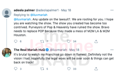 “Any update on the lawsuit?. We are rooting for you. I hope you are watching the show. The show you created has become too contrived. Purveyors of Pop & Heavenly have ruined the show. Bravo needs to replace POP because they made a mess of M2M LA & M2M Houston.”