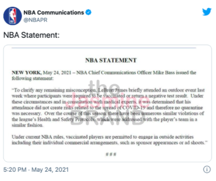 “LeBron James briefly attended an outdoor event last week where participants were required to be vaccinated or return a negative test result. Under these circumstances and in consultation with medical experts, it was determined that his attendance did not create risks related to the spread of COVID-19 and therefore no quarantine was necessary.”