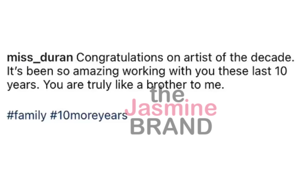 “Congratulations on artist of the decade. It’s been so amazing working with you these last 10 years. You are truly like a brother to me,”