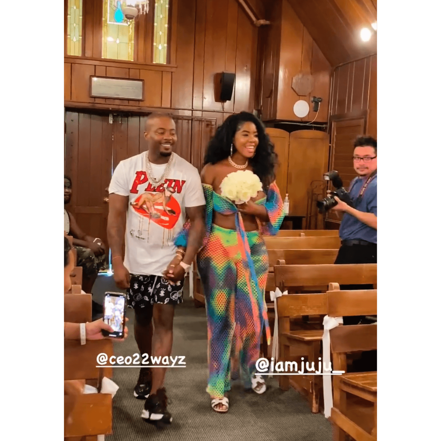 Dressed in a two-piece bathing suit with a two-piece colorful cover-up on top, Juju looked stunning and happy. Check out the IG photos below of the wedding: