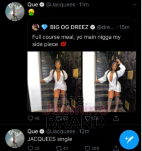 Dreezy and Jacquees have been in an on and off-again relationship for the past few years. Last October things seemingly took a turn for the worst and the pair publicly dished out their issues in a nasty Twitter breakup. Jacquees quote retweeted one of Dreezy’s pictures and added the throw-up emoji. He then announced that he was single.