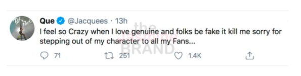 “I feel so Crazy when I love genuine and folks be fake it kill me sorry for stepping out of my character to all my Fans…”