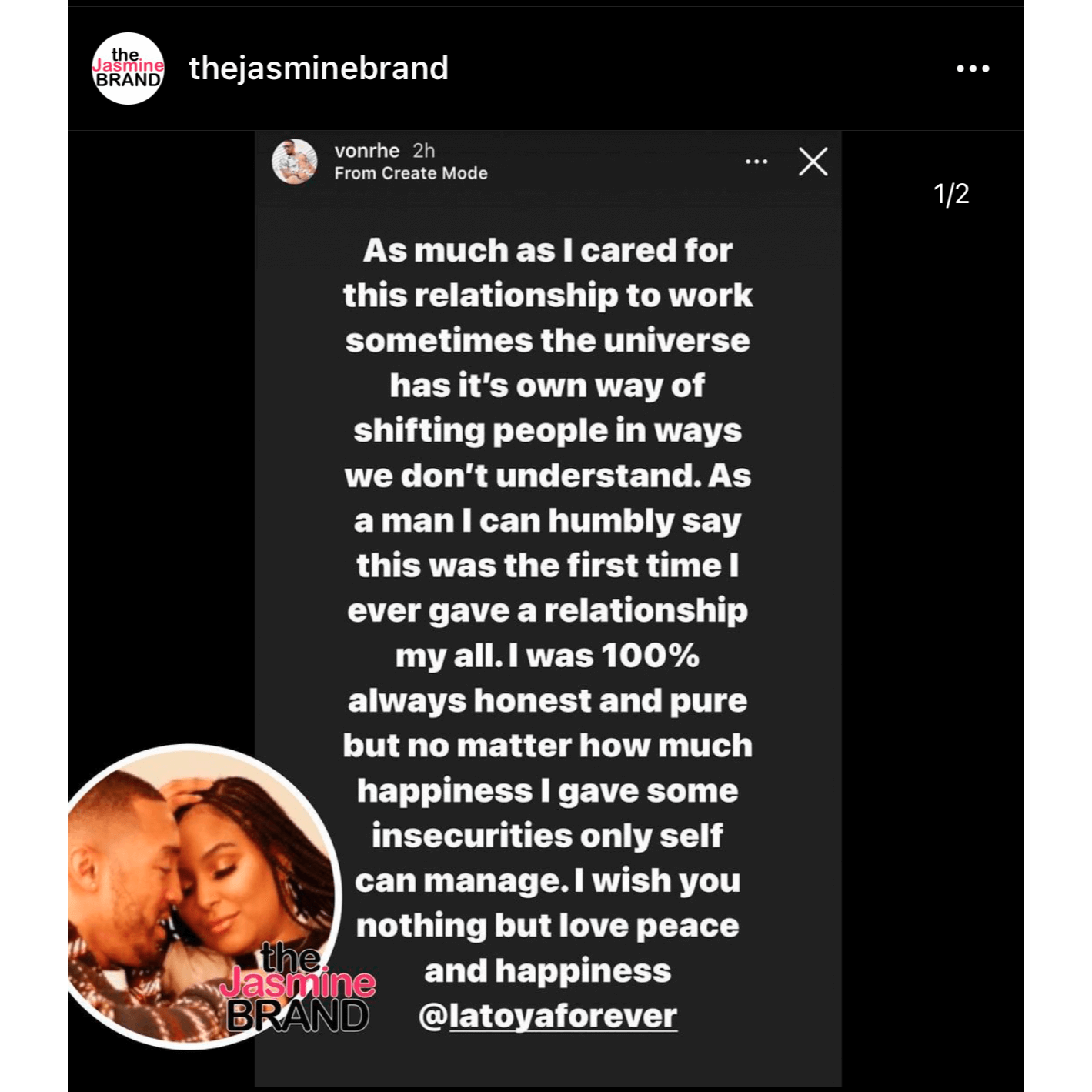 Von Rhé posted a message to his Instagram that appeared to be a breakup notice to LaToya Ali. He wrote: